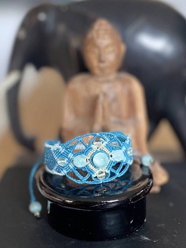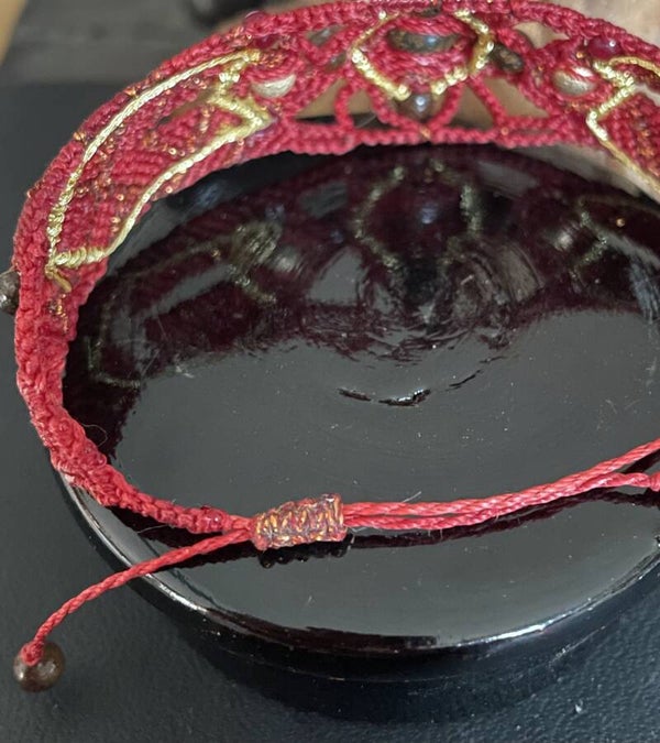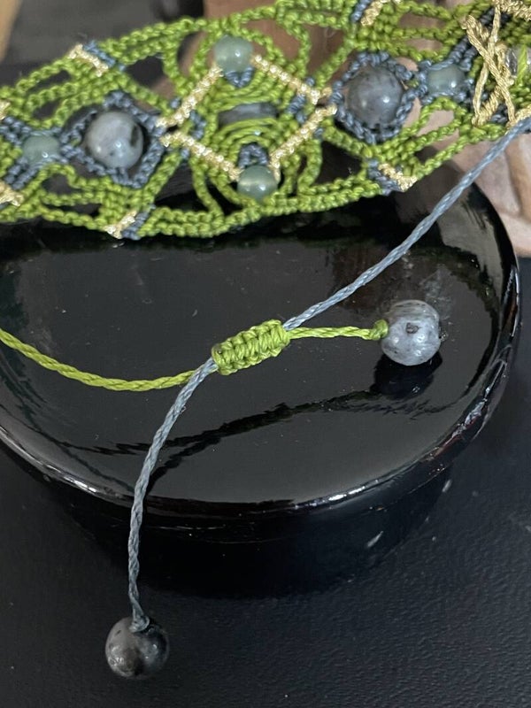 Des jolies perles en pierre naturelle enlacées délicatement dans des fils de LinHasita 0,35 mm (fil polyester) embelliront votre poignet.