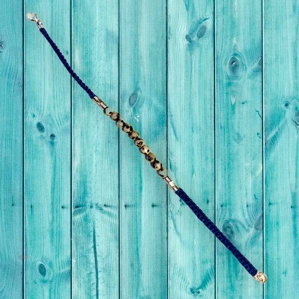 Perles de Jaspe Dalmatien enlacées sur du fil de macramé bleu 0,35 mm.