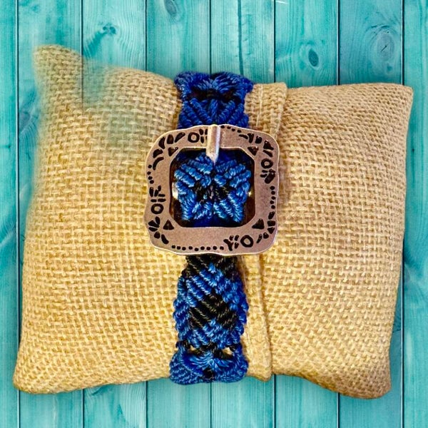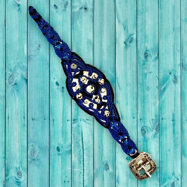 Perles de Jaspe Dalmatien enlacées sur du fil de macramé bleu et noir 0,75 mm.